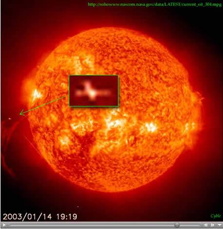 На этом фотоснимке отснята раскаленная масса. В выделенной рамке видна не успевшая охладиться частица, выброшенная из недр планеты. В просторах Вселенной часто можно втретить осколки других планет, не несущих жизни. Это незначительный ущерб для объекта, когда не внутрь его, а наружу направлено давление огромной силы. Взрыва в этом случае не происходит, происходит односторонний выброс с отрывом тела планеты.