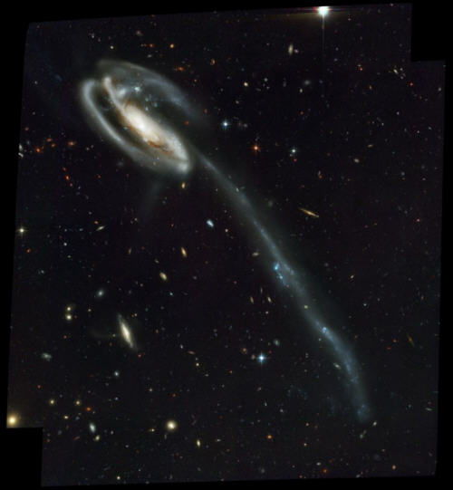 телескопа Хаббла, далекие галактики создают эффектный фон для разрушенной спиральной галактики Арп 188 - галактики Головастик.