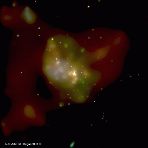 Колоссальная рентгеновская вспышка, вызванная чёрной дырой в центре нашей Галактики, образовала яркое пятно на этом изображении, полученном Орбитальной Обсерваторией Chandra. В частности, для мощной рентгеновской вспышки, наблюдавшейся Обсерваторией Chandra, учёные определили, что в центре нашей Галактики, вещество с массой в 2.6 миллиона масс Солнца расположено в объёме размером не более 93 миль. Согласно известным законам физики, только чёрная дыра может быть такой плотной