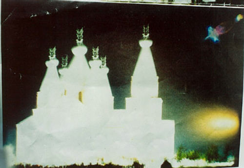 Фотография отснята на Пасху Валентиной Бондаренко. Над церковью справа вверху виден малый летательный космический объект выполняющий сжигание энергии негатива и посылающий чистящий луч на храм.