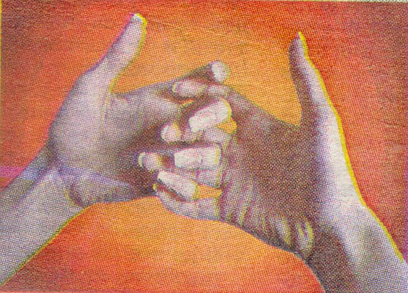 Рисунок- кодировка, направлен на Душу, на принятие Душой негатива. Красный фон – негатив. Пальцы рук сомкнуты на красном фоне - негатив принят в Душу.