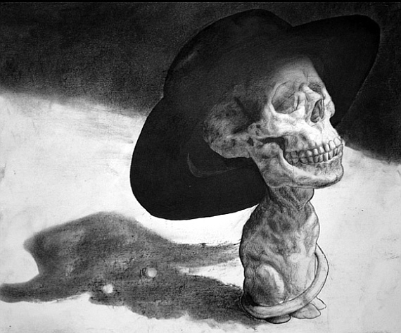 Рисунок- кодировка, направлен на Душу, вызывает ухожат (смерть) . На тени 2 глаза – также кодировка на ухожат. Чёрная шляпа усиливает кодировку, направленную на Душу (шляпа – 5 букв, чёрный цвет – негатив).