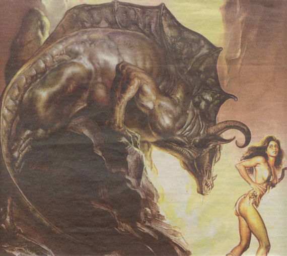 Животное олицетворяет негатив на Матери Земле, очень мощный и сильный. Коричневый фон – символ негатива. На жёлто- белом фоне обнажённая контактантка негатива, желающая верно служить негативу. Бог Отец не даёт защиту контактантам, идущим путём служения негативу. Над спиной животного лицо, на спине фигуры людей зомби, это конечный результат работы негатива.