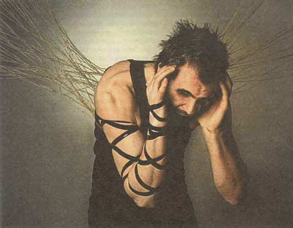Рисунок-кодировка, направлен на Душу, на принятие Душой негативных энергий Поля 6 Зет. К человеку подсоединены негативные энергии Поля 6 Зет, вызывающие изменения в здоровье человека (головная боль, шум в ушах и т. д.). Человек в чёрном - заполнен негативом. Правая рука фиксирует внимание на негативе (чёрные полосы). Тёмный фон рисунка усиливает кодировку.