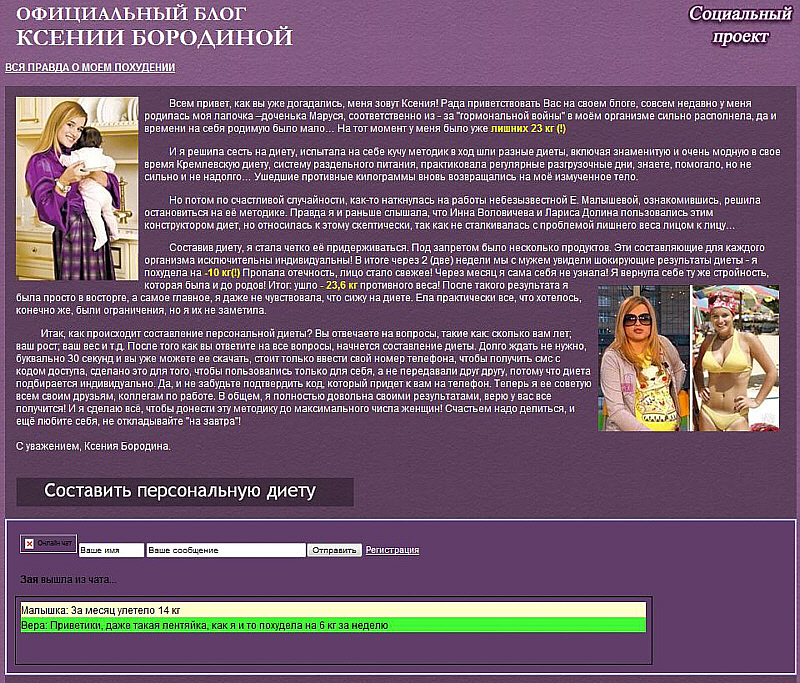 На странице кодировка, направленная на Душу, на приняти негативных энергий Поля 6 Зет и на истощение организма. Кодировки смысловые и цифровые: 23 кг - кодировка на Душу. 23,6 - кодировка на принятие Душой негатива. 30 секунд - кодировка. 14 кг - кодировка. В предложении: "Официальный блог Ксении Бородиной" содержится 30 букв - кодировка.