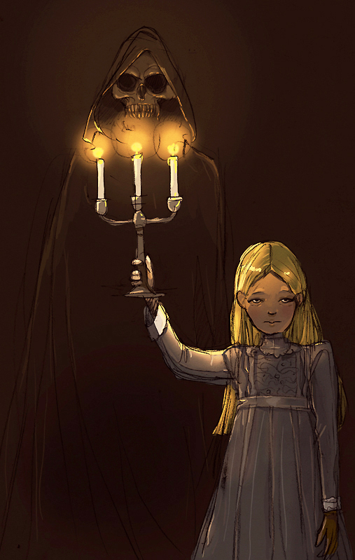 Рисунок-кодировка, направлен на Душу, на принятие негатива и на ухожат. Три свечи - кодировка на принятие негатива. Рядом с девочкой изображён образ смерти - кодировка на ухожат. Причёска у девочки из 2-х частей-- усиление кодировки. Тёмный фон также усиливает кодировку.