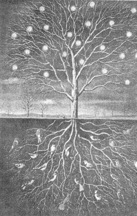 Рисунок - кодировка, направлен на Душу, вызвать желание Души покинуть физическое тело. На дереве 23 энергетических сгустка = 5 - Душа. На корнях дерева 20 птиц = 2 - ухожат.