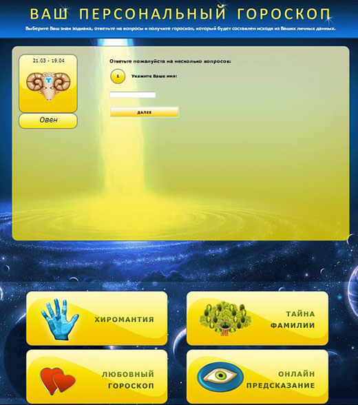 На странице кодировка направлена на Душу, на принятие Душой негативных энергий Поля 6 Зет. Рог овцы коричневого цвета, состоит из 6 частей - кодировка. Текст: Ваш персональный гороскоп (23 буквы) - кодировка на Душу. 5 пальцев - кодировка направлена на Душу. Жёлтый и синий цвета вызывают желание принять кодировку.