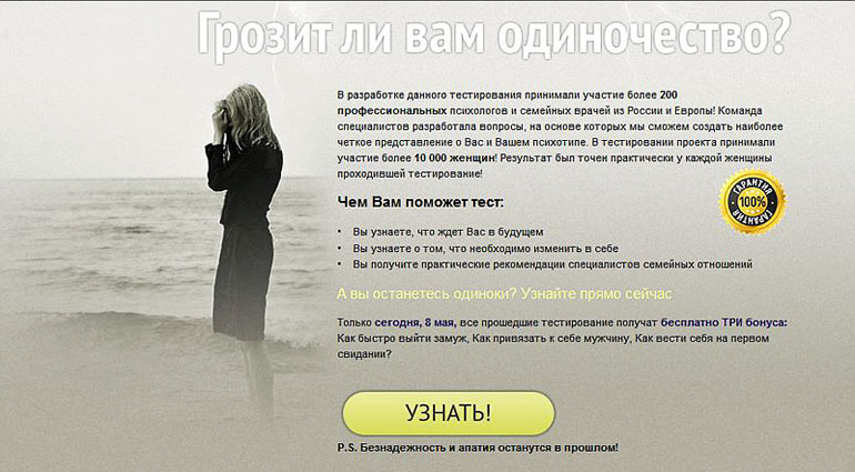 На странице кодировка, направленная на Душу, на ухожат. В предложении; Грозит ли вам одиночество? - 22 буквы - кодировка на ухожат. Человек в чёрных одеждах плачет - усиление кодировки.