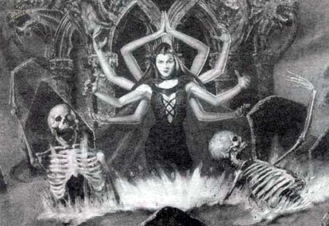 Рисунок – кодировка, оказывает воздействие на Душу, вызывает ухожат. 2 скелета символизируют смерть. На переднем плане изображён холм - (могила).