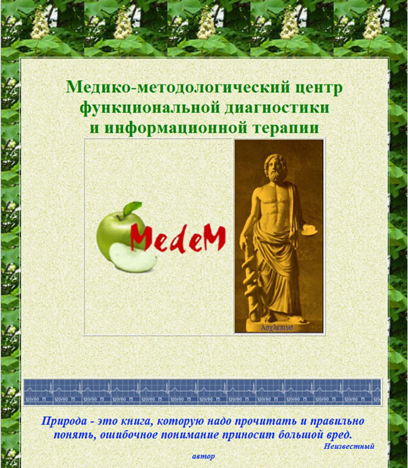 На странице кодировка, направленная на Душу, на заполнение Души негативом и на ухожат. Слово «МЕДЕМ» - 5 букв красного цвета, яблоко- форма Души – заполнение Души негативом. Предложение: Медико-методологический центр функциональной диагностики и информационной терапии – 74 буквы = 11 – кодировка на ухожат. 2 длинных строчки внизу текста усиливают кодировку.