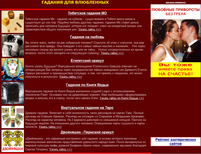 Рисунок- кодировка, направлен на Душу, на принятие Душой негатива и на ухожат. Слева 6 рисунков – кодировка на принятие негатива. Белый текст на коричневом фоне состоит из 30 строчек – кодировка на принятие негатива. Справа 2 человека – кодировка на ухожат. Текст: Гадания для влюблённых – 20 букв – кодировка на ухожат. Рисунок слева (внизу) «Двойняшки» - усиление кодировки на ухожат. Справа (внизу) две строчки текста – усиление кодировки на ухожат.