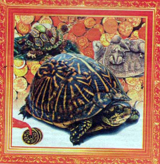 Рисунок-кодировка, направлен на Душу, на ухожат. Черепаха «разделена» на 2 части – кодировка на ухожат. Рамка усиливает кодировку. Монеты оказывают воздействие на Душу.