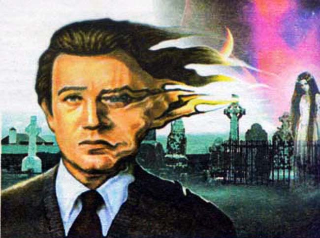 Рисунок - кодировка, направлен на Душу, на ухожат. В оградке Душа, памятники- кодировка на ухожат. Человек в чёрном костюме – усиление кодировки. Рисунок концентрирует внимание на двух частях лица – усиление кодировки.