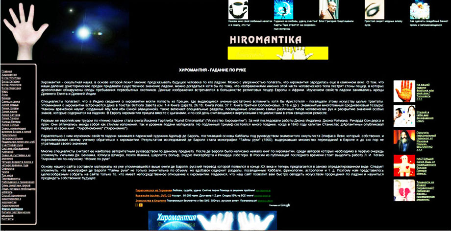 На странице кодировка, направленная на Душу, на ухожат. Слово «Хиромантика» - 11 букв – кодировка на ухожат (смерть). Кисти рук: 2 + 2 – кодировка на ухожат. Пальцы рук внизу: 2 + 2; 2 + 2 – кодировка на ухожат. Круг - воздействие на Душу. Остальное концентрирует внимание на кодировке.
