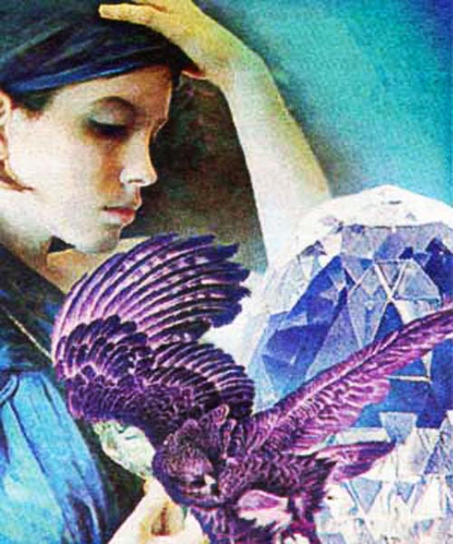 Рисунок- кодировка, направлен на Душу, на ухожат. Изделие из хрусталя имеет форму Души. На нём триугольники вершиной вниз – кодировка на ухожат. Крыло птицы (символизирующей Душу), состоит из 11 перьев – кодировка на ухожат. Человек в горе – усиление кодировки.