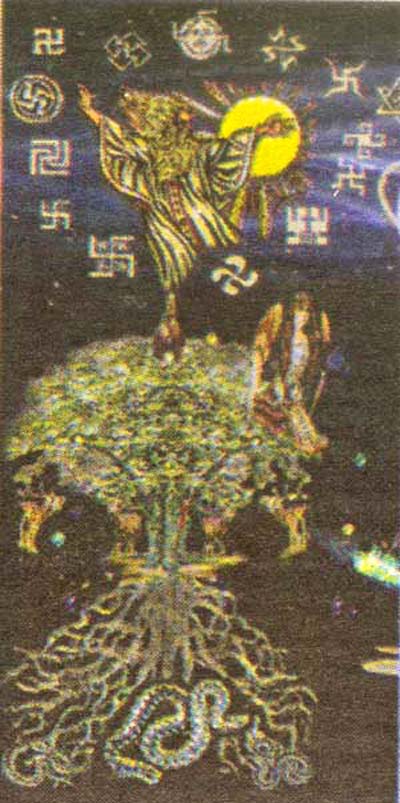 Рисунок- кодировка, направлен на Душу, на ухожат. Солнце – воздействие на Душу. Вокруг 14 знаков – проводников негатива. Рядом со знаками чёрный маг, усиливающий кодировку. Крона деревьев состоит из двух одинаковых частей, корни разделены на 2 части – кодировка на ухожат Души. Вверху на кроне видны Души. Тёмный фон усиливает кодировку.