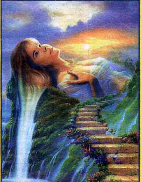 Рисунок - кодировка, направлен на Душу, на ухожат. 20 ступенек – кодировка на ухожат. 2 больших водопада – также кодировка на ухожат. Человек лежит – усиление кодировки. Облака также усиливают кодировку Общий фон рисунка вызывает желание принять кодировку.