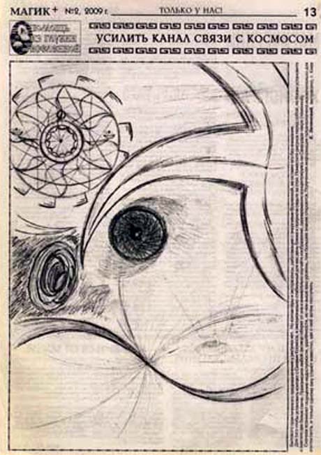 Рисунок-кодировка, направлен на Душу, на принятие Душой негативных энергий. Круг –воздействие на Душу. По периметру круга: вверху 6 элементов; внизу – 3, что обозначает негатив, направленный в Душу. В центре этого рисунка также изображён круг, разделённый по периметру внизу и вверху на 12 частей. 12+12 = 24 – энергии Поля 6 Зет. Весь остальной рисунок для усиления кодировки.
