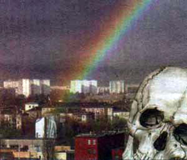 Рисунок- кодировка, направлен на Душу, вызвать заболевание Души, мрачное, отрицательное настроение. Радуга – символ жизни, радости – изображена на заднем плане. На фоне домов (Душа) изображён череп – символ смерти. Череп изображён на переднем плане. Кодировка заключена именно в этом художественном приёме. Коричневый фон – негатив, усиливающий действие кодировки.