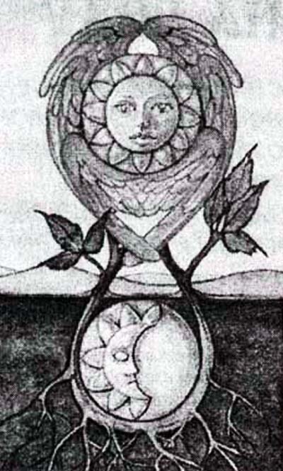 Рисунок-кодировка, направлен на Душу, на ухожат. Симметричный рисунок – кодировка на ухожат. Нижняя часть рисунка усиливает кодировку (круг – воздействие на Душу). Половина лица с семью элементами по кругу – уход жизни. Корни усиливают кодировку (уход жизни в землю). Чёрный цвет также усиливает кодировку. 7 листочков символизируют уход жизни.