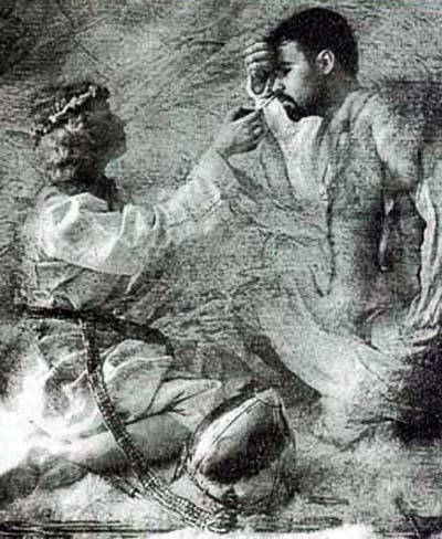 Рисунок- кодировка, направлен на Душу, на ухожат. 2 человека - кодировка на ухожат. 2 руки, 2 раза по 5 пальцев – усиление кодировки на Душу, на ухожат Души. Остальное усиливает кодировку.