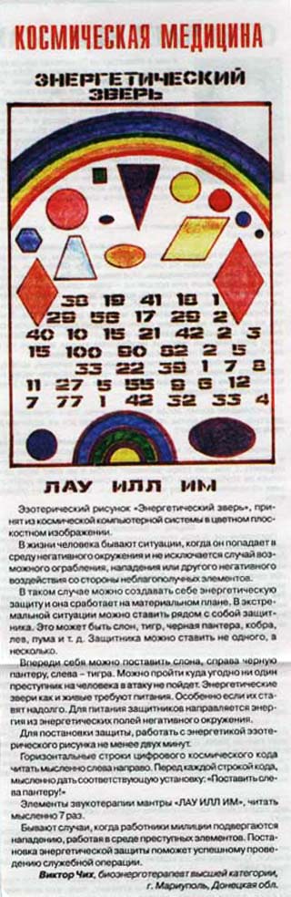 Рисунок-кодировка, направлен на Душу, на ухожат. В верхней части рисунка 14 геометрических фигур – кодировка на Душу. Треугольник вершиной вниз – кодировка на ухожат. Возле 2-х строчек цифр 2 ромба – кодировка на ухожат двойной силы. 7 строчек цифр – усиление кодировки. Радуга усиливает кодировку и вызывает желание принять её. Текст: КОСМИЧЕСКАЯ МЕДИЦИНА – 19 букв. Текст: Энергетический зверь – 19 букв. 19 + 19 = 38 = 11 – ухожат. Рисунки внизу концентрируют внимание на кодировке.