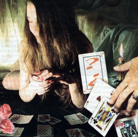 Гадание на картах связано с чёрной магией. Свеча – необходимый атрибут чёрных магов. В рисунке заключается кодировка направленная на Душу (справа 5 карт), на желание служить негативу (внизу два ряда по 6 карт). Розы для желания принять кодировку.