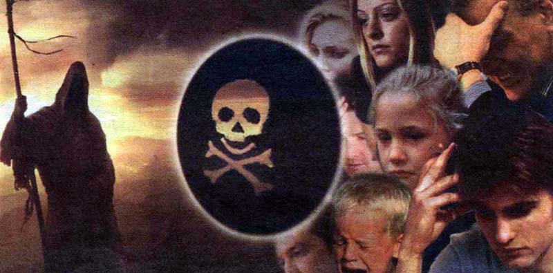 Рисунок – кодировка, направлен на Душу, вызвать страх смерти. В центре рисунка эмблема смерти направлена на Душу (форма Души). Слева изображён служка Люцифера, выполняющий работы по ухожату. Для усиления кодировки изображены лица с отрицательными эмоциями.