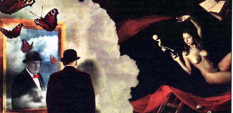 Рисунок – кодировка, направлен на Душу, на ухожат. Человек в тёмном – принявший негатив. Человек в рамке – находящийся в гробу (4 – угольник). Вокруг 5 бабочек – Душа летает вокруг физического тела. Обнажённое тело – для усиления кодировки (концентрация внимания на симметричных частях - две руки, две ноги, две грудных железы). Остальное также для концентрации внимания на негативе. Тёмный фон – негатив.