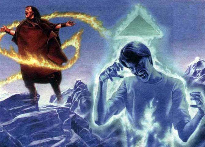 Рисунок – кодировка, направлен на Душу (энергии вокруг человека обозначают круг). Человек в коричневых одеждах – Душа, заполненная негативом. Справа контактант негатива оказывает воздействие на Душу (кисти рук, 5 и 4 пальца). Контактант агрессивен и заполнен негативом. Над головой треугольник, указывающий на то, что он посвятил свою жизнь негативу.