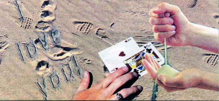 Рисунок-кодировка, направлен на желание служить негативу. Игральные карты - негатив. 3 руки - зло негативных действий.