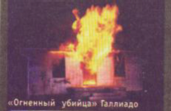 В газете « ТАЙНЫ ХХ ВЕКА» (НОВИНКА) На странице 2 помещена фотография «Огненного убийцы» Галлиадо. Предистория этого фото такова: Любитель фотоохоты за призраками Хорхе Руис Галлиадао под вечер 14 июля 2001 года уединился в собственном кабинете и хотел передать снимки привидений в Интернет. Через три минуты над домом его появилось что-то странное: словно сверху на него опустилась полупрозрачная сеть! Через 10 секунд из окна Галлиадо вырвался столб огня! Друг начал снимать эту картину, из входной двери дома вылетела огненная фигура. Мгновенно пламя охватило дом и Галлиадо погиб.