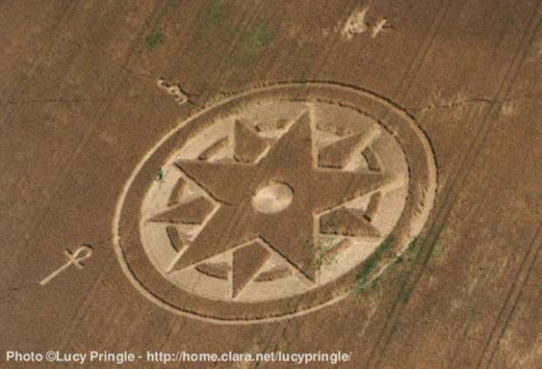 Five points are a sign of continuos movement of life and energy. A scheme of overlapping of energy fields. In the upper part on the left near the circle there is a sign of the fixing of energy-intellect in the study. The sign near the circle in the lower part on the left is a sign of sending of intelligent energy.