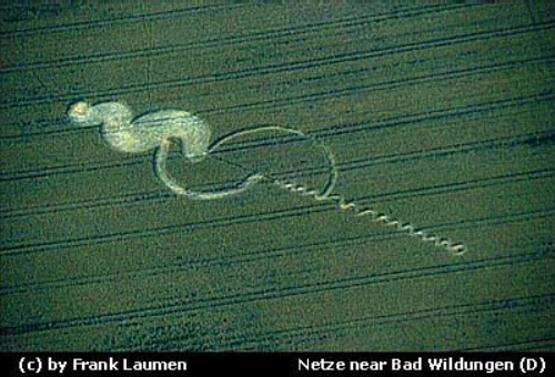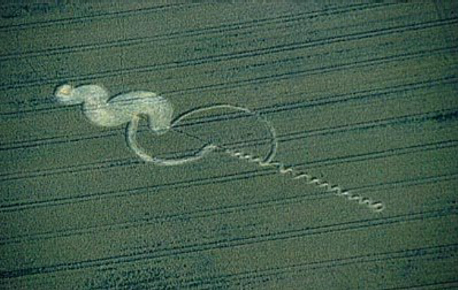 This pictogram was left by aliens for earthlings as a sign of friendship and respect for the inhabitants of Earth. It shows the face of an alien. It means that the aliens want to help people. The Earth is represented as a black bird whose tail ends with a streamer ribbon, which means celebration, joy and friendship. Near the bird there are faces of aliens who want to help people. Archintelligent God Khach.