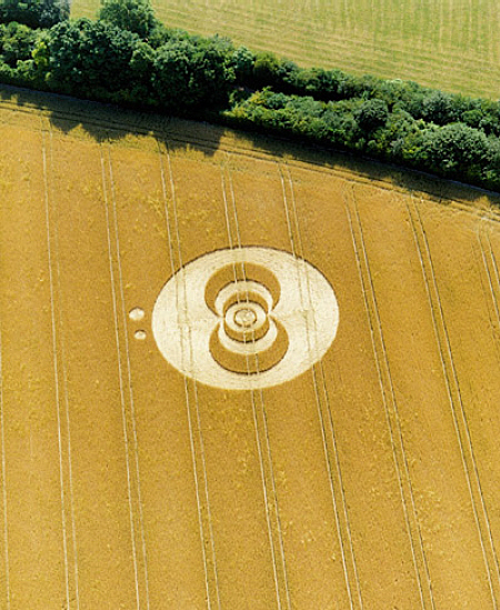 This picture was not made by extraterrestrials; it was made by negative contactees. This picture is an encoded message aimed at the Soul, at its willingness to leave the physical body. The picture represents a Soul; in the center it is divided into two parts which means the Soul’s leaving the physical body. Outside the white circle (Soul) we can also see two little white circles; the number two symbolizes death. Archintelligent God Nefhchuht.