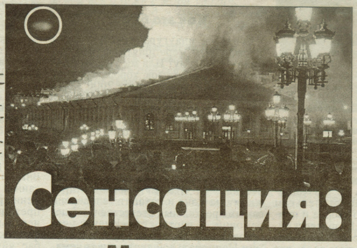 «Сгоревшее дотла 14 марта здание Манежа в самом центре Москвы привлекло к себе внимание учёных-уфологов и специалистов по изучению аномальных явлений со всего мира. Оказывается, в то время как полыхало пламя, сотни людей, оказавшихся поблизости, наблюдали в небе неопознанный летающий объект. Специалисты в один голос утверждают: это самое яркое НЛО последнего времени. Объект представлял собой мутно-розовый овал Его приблизительные параметры составляли метров 50 в диаметре. Однако смотрелся он с земли как игрушечный, поэтому многие на него не обращали внимания. Если же приглядеться к нему, в правой нижней части его можно было увидеть розовую точку, которая периодически моргала, словно передавая сигналы азбуки Морзе. – Сначала люди реагировали на неё как-то вяло, но потом всё больше человек стали показывать пальцем в небо и кричать: «Смотрите, это инопланетяне!». Многие фотографировали… Объект висел на одном месте и почти не двигался часов до двух ночи. Потом неожиданно сместился влево – метров на пятьдесят, и снова замер. Ещё где-то минут через сорок он приближаться, как будто пытаясь зависнуть ровно над столбом дыма, и неожиданно исчез. Всю ночь после того, как сгорел Манеж, на радиостанции «Эхо Москвы» шел прямой эфир. В студию приезжали специалисты разных областей, которые комментировали произошедшее. «Правда, что Манеж подожгли инопланетяне?» - задал вопрос один из позвонивших радиослушателей. В ответ на это гость программы начальник Управления государственной противопожарной службы Москвы Виктор Климкин заявил: «Нет, конечно. Хотя странный объект многие наблюдали в небе – это правда. Но нам было не до того, чтобы его рассматривать – ребята работали, тушили пожар». По мнению известного художника Сергея Андрияки, раньше никогда не видевшего «тарелки», зрелище это потрясающее… Несмотря на то, что корабль издалека казался мелким, ощущалось всё его могущество… И знаете, что странно. Мне до сих пор непонятно, почему же факт появления инопланетного корабля так тщаетльно скрывается? Я смотрел на следующий день все новости – нигде об этом не говорилось. – Просто был указ никому об этом не говорить, не давать комментариев журналистам, - пояснил один из сотрудников милиции, охранявший в ту ночь Манеж и просивший не указывать его имени. – Видимо, секретные службы тоже отслеживали эту тарелку… Не хотели шумихи вокруг этого. Бельгийский профессор Стефан Ирухофа, высказал свой взгляд на происходящее: «Случай в России меня очень заинтересовал, я связался со своими московскими коллегами. Я убеждён, увидев такое сильное пламя, инопланетяне, находящиеся где-то поблизости в атмосфере Земли, решили,что произошло крупное бедствие, и решили прийти на помощь. Если бы пламя потушить не удалось, уверен, они применили бы какие-нибудь свои неизвестные нам технологии, чтобы приглушить огонь. Возможно, они и помогли тушить пожар. Кто знает, может благодаря «зелёным человечкам» пламя локализовали так быстро». Было ли в небе над Красной площадью в ночь с 14 на 15 марта на самом деле НЛО или это всего лишь мистификация, похоже, так и не узнаем. Тем не менее, представляем на ваш суд только одну из многочисленных фотографий, сделанных разными людьми, с разных сторон Манежа».