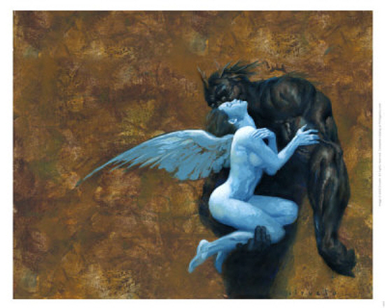 This picture is informational. The negative is personified in Lucifer’s servant, the Forces of Light are personified in the Angel. The idea of the picture is to show the power and force of the negative and belittle the Forces of Light. To show that the Forces of Light are subordinate to the negative, are controlled by it.