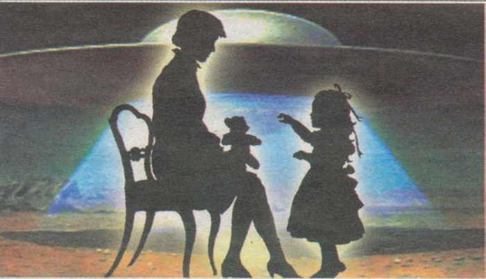 The picture was made by a Light contactee. The people represented are black because UFOs are still a mystery for people. The trapezoid shimmering means that people want to understand the secrets of UFOs. The mother represented in the picture is a representative from other planets and the child is a person wishing to acquire knowledge about other planets and lives on them. The UFO in the background is still unreachable for earthlings. The background around the UFO is dark – people are still a long way from understanding the real aim of UFOs for the Earth and earthlings. The information was provided by the Ruler of Shambala, Archintelligent God Tutan Shantaharad.