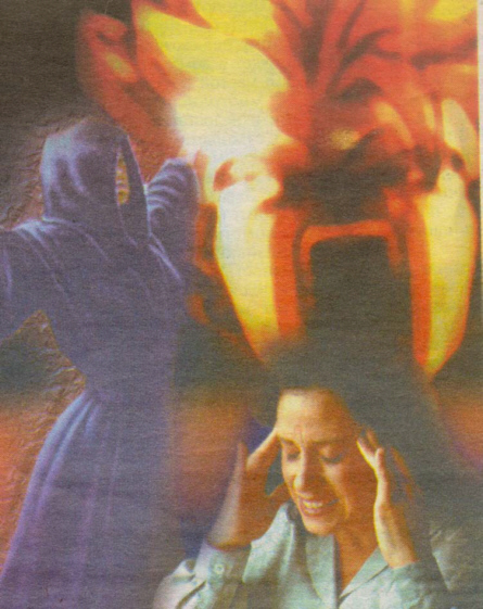 In the picture we can see a yellow burning face of an enraged person who carries the energies of rage and evil to those around him. Negative essences that get into the current of negative energies enter the energy field of an unprotected person with weak energy. The essence settles in his body and causes illness. On the left there is a contactee of Light who can stop the evil on Mother Earth and help earthlings suffering from the negative.