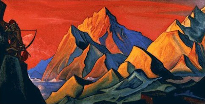 N.Rerich. The picture represents Mother Earth (as a human) lying in a coffin (a dark figure resembling a human being on the background of a big red mountain). On the left one can see an archer searching for a victim. The archer personifies a representative of the negative on Mother Earth who harms people. People are responsible for the planet’s death.