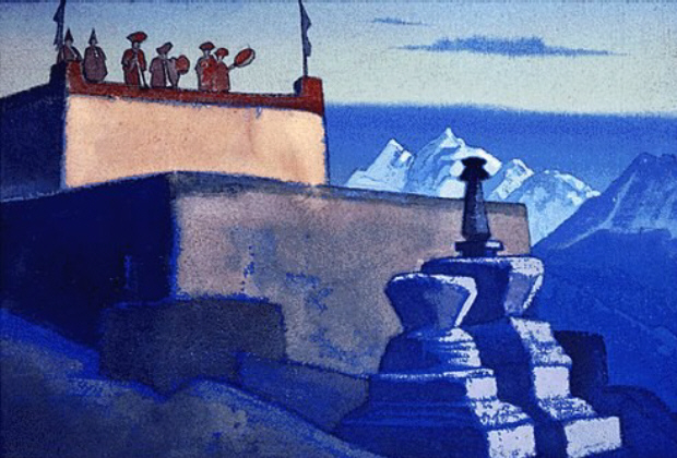 N.Rerich. This painting is an appeal to the brotherhood of earthlings and extraterrestrials. On the left there is a terrestrial spaceship; people greet Cosmic spaceships and aliens. Near the terrestrial spaceship there is the head of an alien facing the extraterrestrial spaceships. On the terrestrial spaceship (at the front) we can see a Soul. The artist asks people to clean their Souls in order to live in brotherhood with aliens.