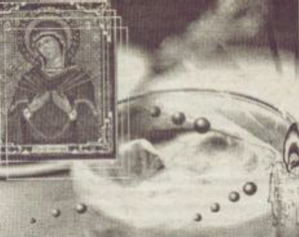 The picture shows a rite of water blessing with the help of an icon and a prayer. The energies coming from Space (the four small circles in the foreground) purify the water and give it a positive charge and healing energies; the negative (the three small circles) goes away. If the water has been treated with the negative, when a contactee of Light blesses it, negative manifestations can be seen on it (as shown in the picture). A contactee of Light who blesses water for a sick person can also see in the water the negative coming out of the sick person.