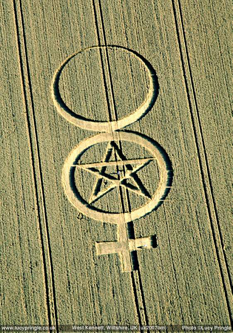 The picture was made by extraterrestrials. The purpose of the picture: an appeal to people to free their Souls from the negative by asking God, the Cross and the Prayer for help. The content of the picture: the two joint circles personify the friendship between the Universe and planet Earth. The friendship will get stronger thanks to the purification of human Souls (the circle with a star as big as a five-kopeck coin) by means of prayers (the cross).