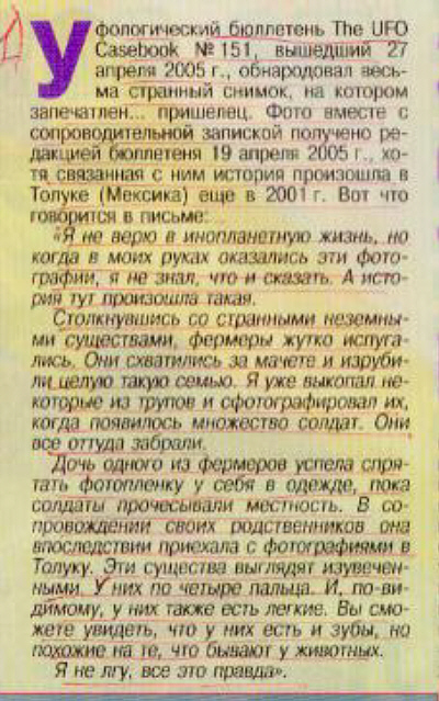 На экспертизу прислали фрагмент статьи «земляне освоили технологии пришельцев?» опубликованную в журнале «НЛО» № 22 за 30 мая 2005 года и фото пришельца.