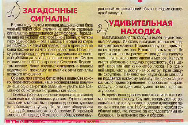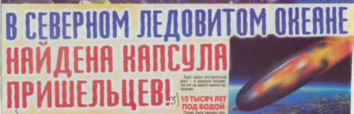«В Северном Ледовитом океане найдена капсула пришельцев». «Загадочные сигналы». «Удивительная находка». Метал не поддается анализу. Геный ресурс. Представители инопланетной цивилизации. После сигнала на реконсервацию капсула откроется и нам следует ожидать либо рабства либо уничтожения. «Это зародыш новой цивилизации». «Будующее неопределенно».