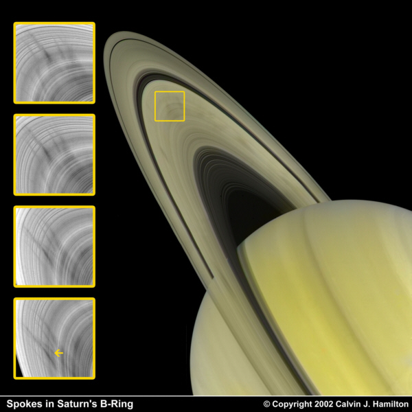 На фото видно, что кольца Сатурна пересекают тёмные полосы, это скопление концентрированного углеродистого калия, находящегося в большом количестве возле планеты, окружает её.