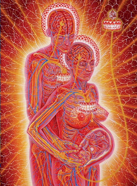 Рисунок- кодировка, направлен на ухожат (смерть). Два человека обозначают ухожат. Рождение ребёнка (выход жизни из физического тела матери) в данном случае фиксирует внимание на кодировке, на ухожате. Зафиксирована также теменная чакра – место выхода Души. Красно-коричневый фон (негатив) усиливает кодировку.