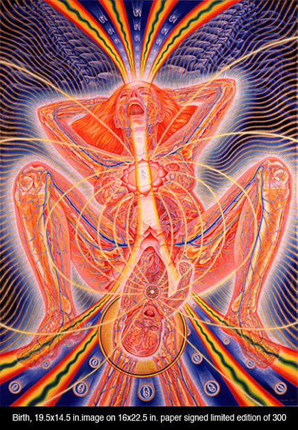 Рисунок-кодировка, направлен на Душу, на фиксацию внимания на Душе (зафиксирована чакра Души). Кодировка направлена на ухожат (смерть). Изображён процесс рождения ребёнка. Из матери выходит жизнь. Этот приём использован, чтобы зафиксировать внимание выхода жизни из физического тела. Красно-коричневый фон- негатив, заполнивший человека перед ухожатом. Зафиксирована теменная чакра – место выхода Души.