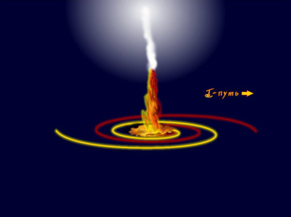 Рисунок- кодировка, оказывающий воздействие на Душу, на разум Души, на выбор жизненного пути (путь Света и путь негатива – 2 спирали). Душа изображена кругом нежных тонов. На Душу направлены негативные энергии Земли (коричневый факел исходит из Земли). Душа, заполняясь негативом, изберает путь служения негативу. Запись со стрелкой – для фиксации внимания на негативном пути.